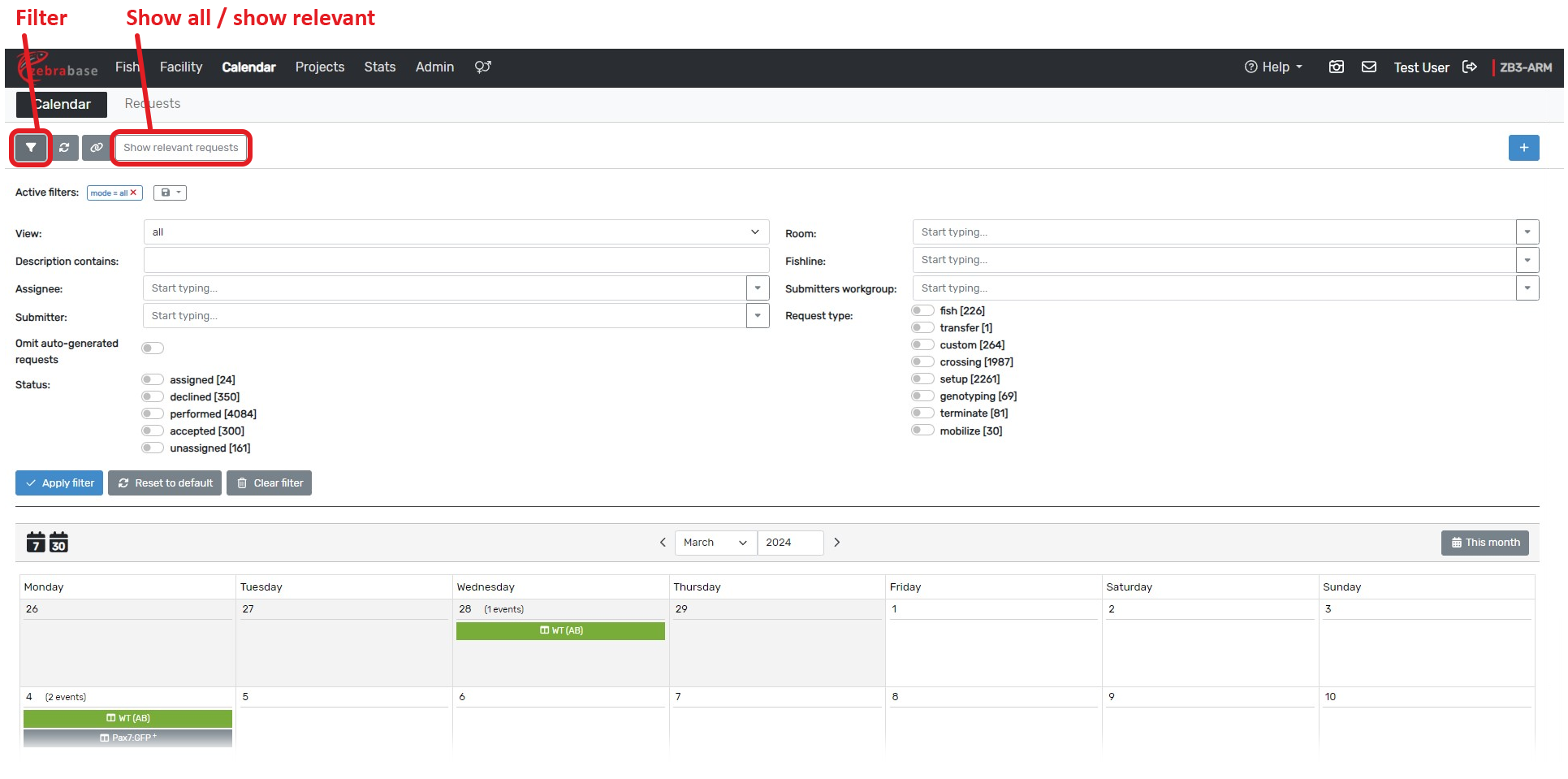 The calendar can be displayed in the form of a weekly or monthly view. A filterable list of all requests is available in the Requests submenu.