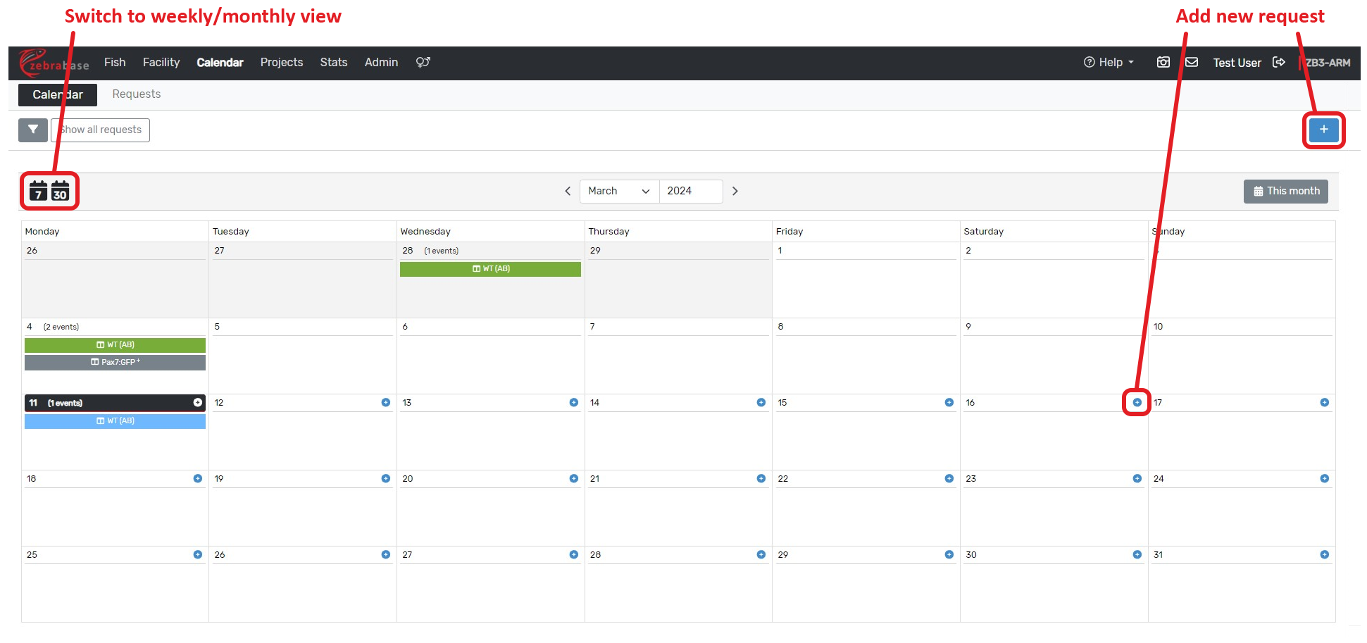 The calendar serves as an interface for planning experiments and other procedures. The user can request actions from the facility staff and other users, or plan an action or a task for oneself. To create a request, click Add request in the Action menu or click the Plus button in the calendar. By default, all users can add requests, but this right can be restricted for each request type in Admin/