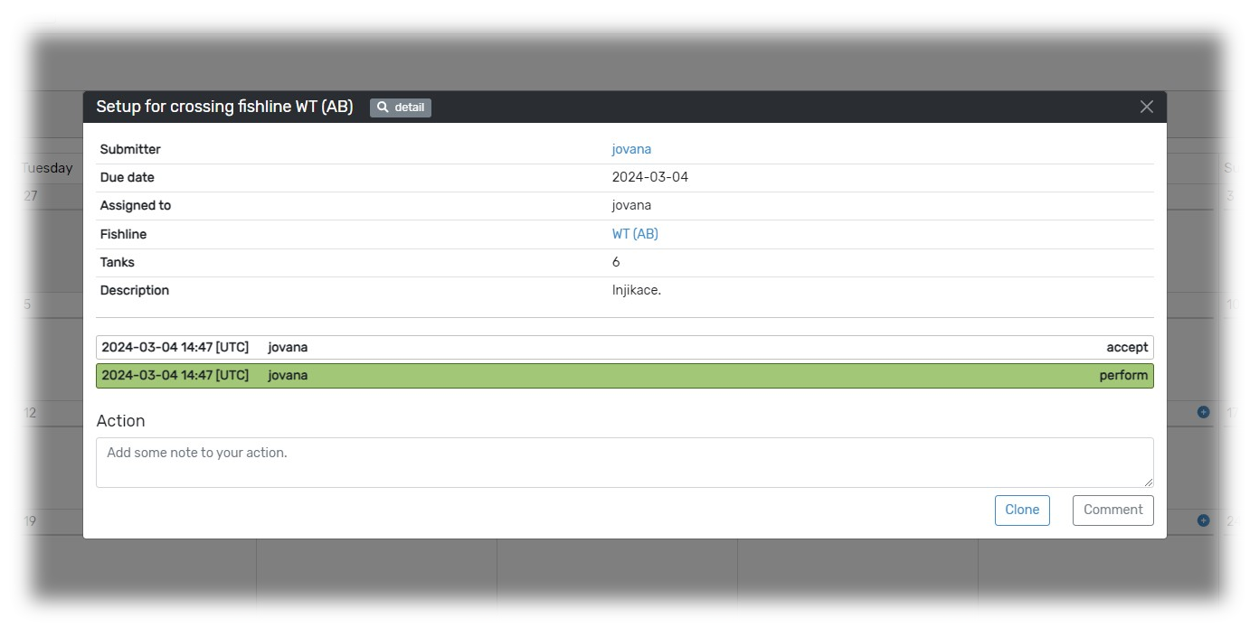The changes in the status are visualized in the request detail, including user comments. Comments can be added to a request independently of any action, or can be connected to a specific action. For the action Decline, it is mandatory to enter an explanation before saving the action.