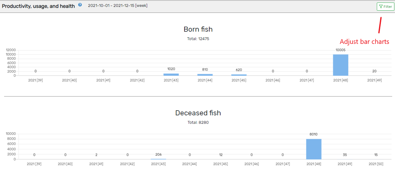 Statistics displays an overview of your facility's fish stocks. Using the export button in the top right corner you can export the data to a .xls file based on the selected filters.