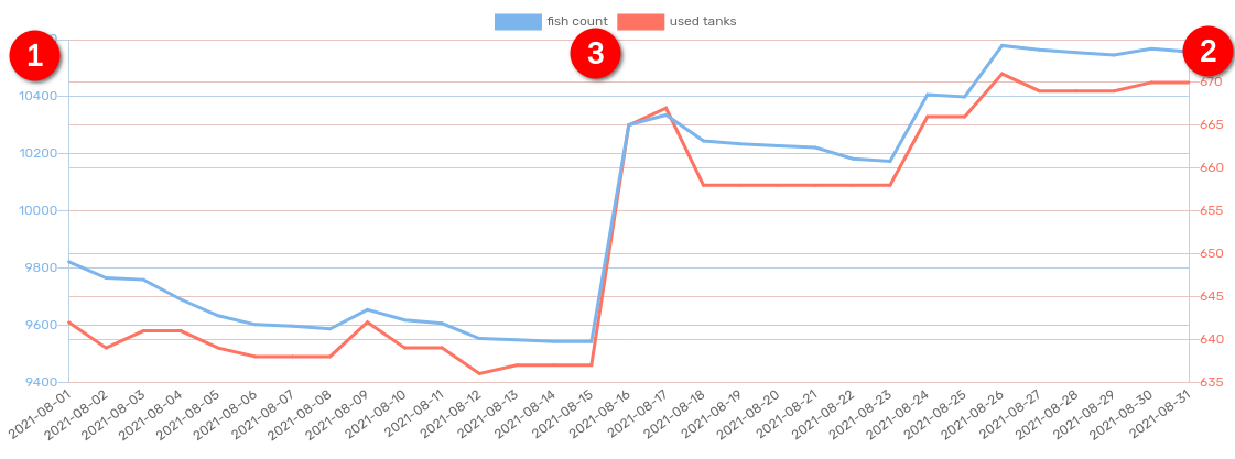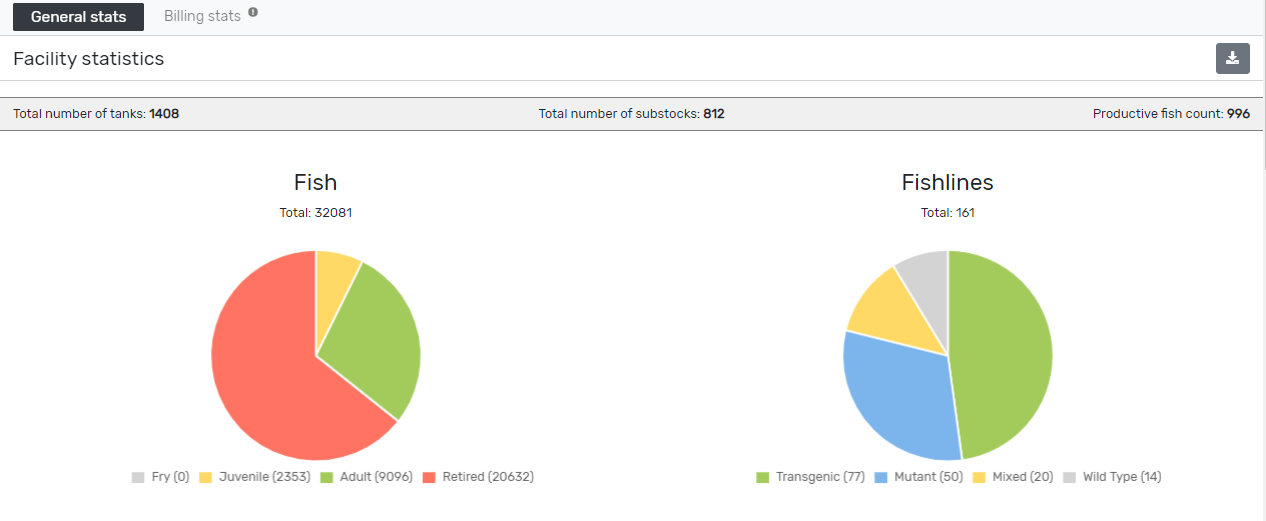 The billing statistics report the number of living fish and used tanks over a given period. The default period is the last whole calendar month; this can be changed in the Filters.