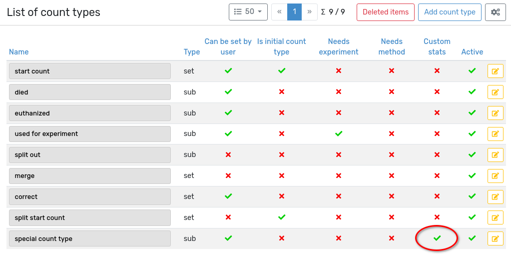 Other count types can be included in the statistics by setting the count types parameter custom stats to True (go to Admin > Codebooks > Count Type).