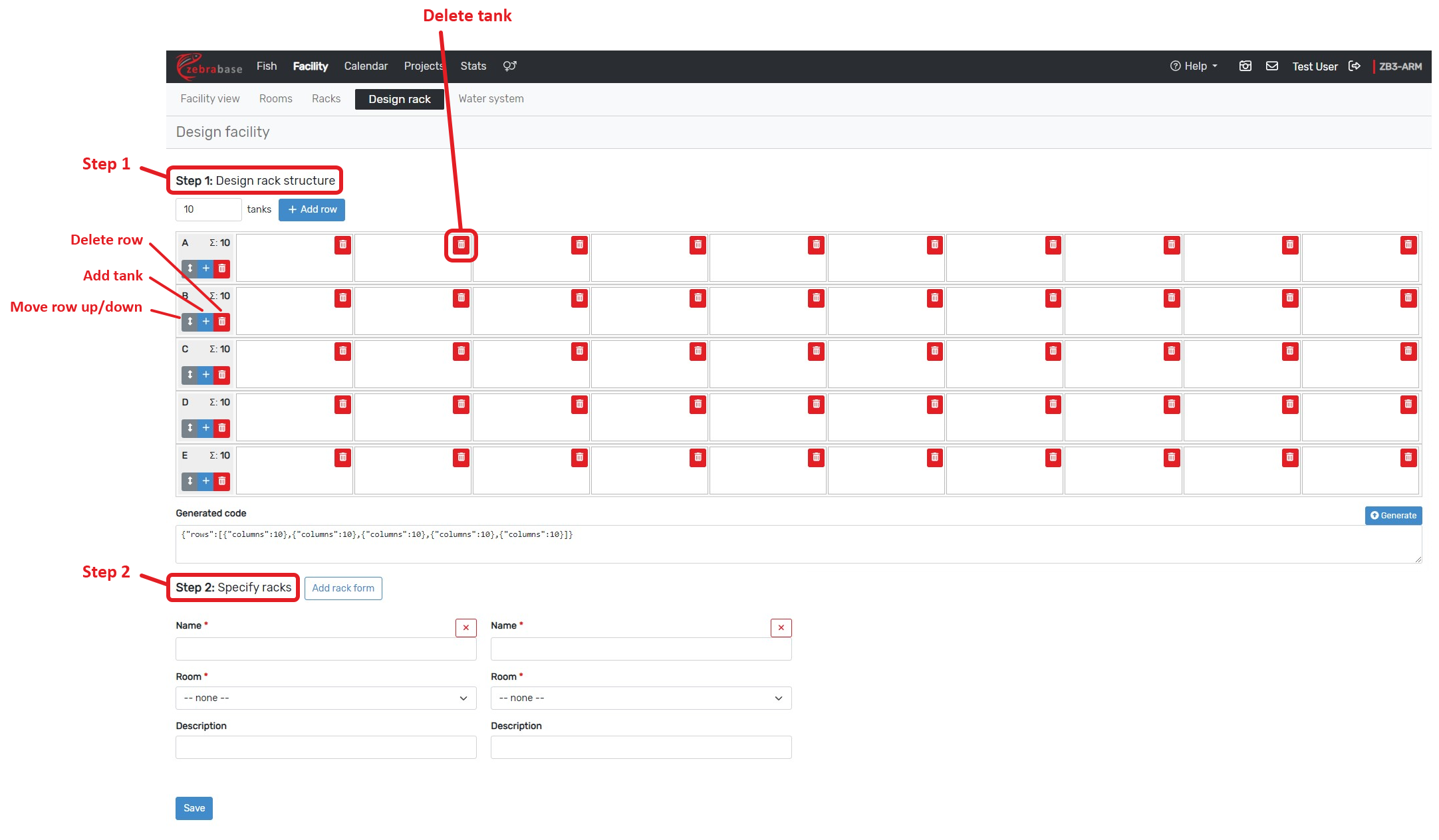 Once you have your rooms defined, you can fill them with racks. In Step 1, you can define the number of rows and columns independently for each rack you add to your facility. In Step 2, enter the name of your rack and select the room. To use the rack setup for multiple racks, click Add rack form and fill in the new form. Please, note that Zebrabase currently supports tanks occupying up to 4x standard tank width.