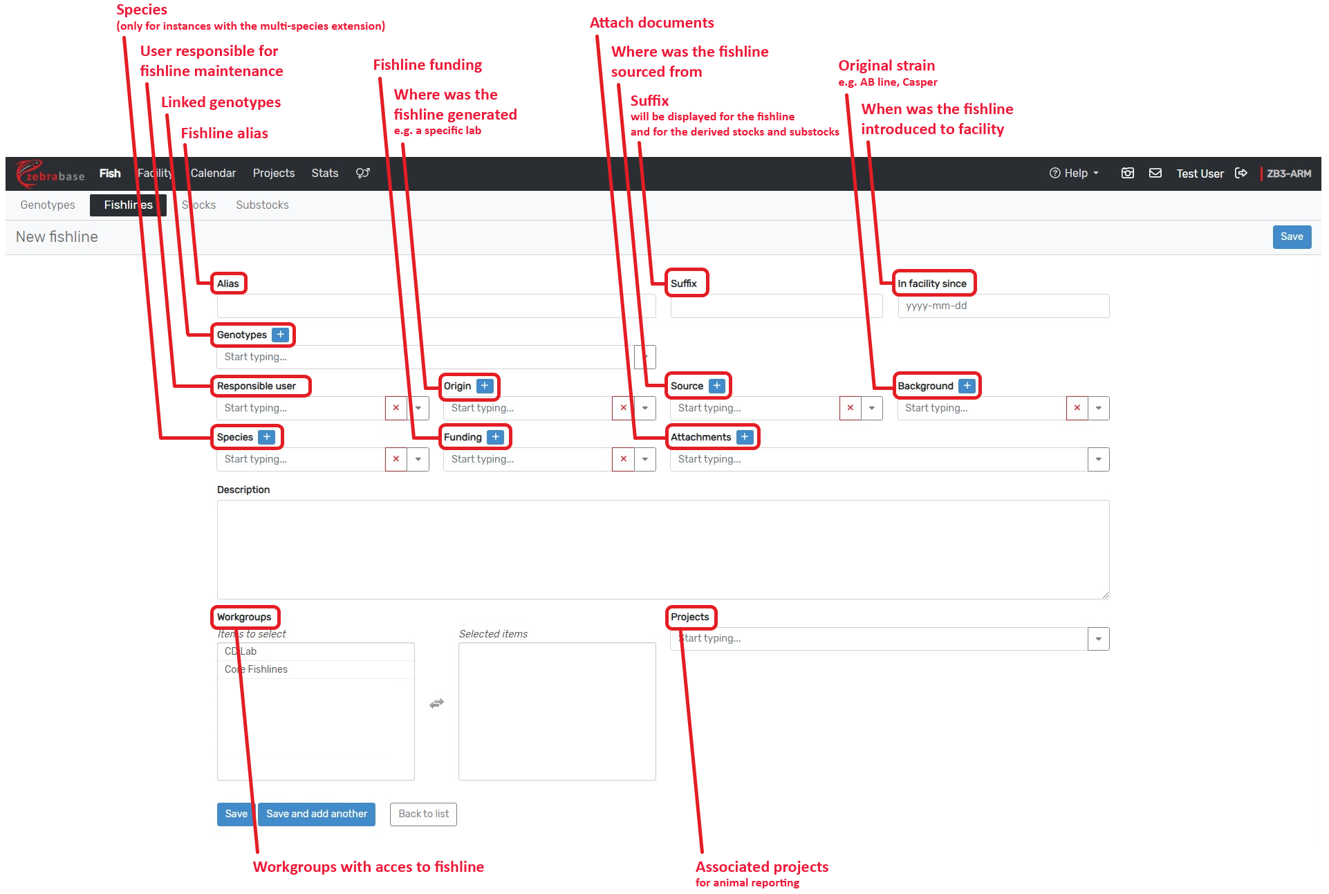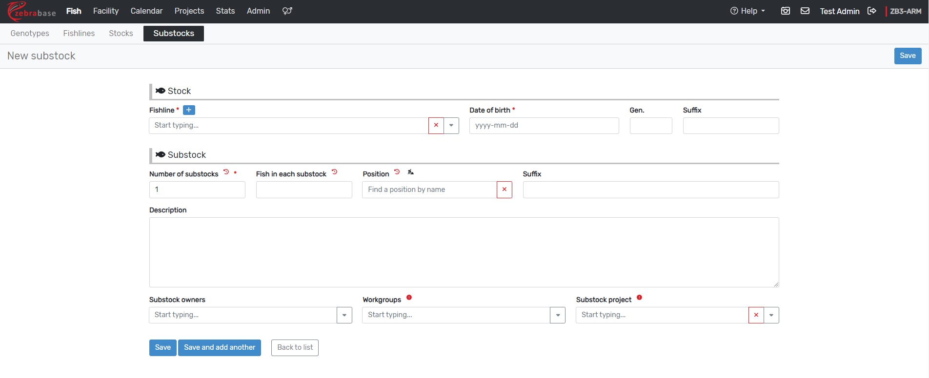 Usually, substocks are created automatically by the Crossing action. Founder substock should be created only in case it is necessary, e.g. when receiving fish from another facility, or when setting up Zebrabase.