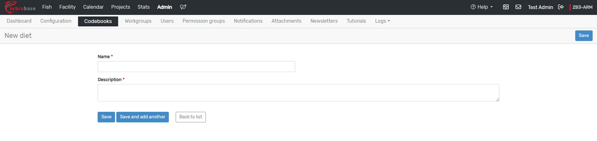 If you are planning to assign different diet and light conditions to different substocks, first you need to define them to be able to use them for your fish. Go to Admin / Codebooks, and select either Diet or Light. You can input new conditions by clicking the blue plus button in the upper right corner.