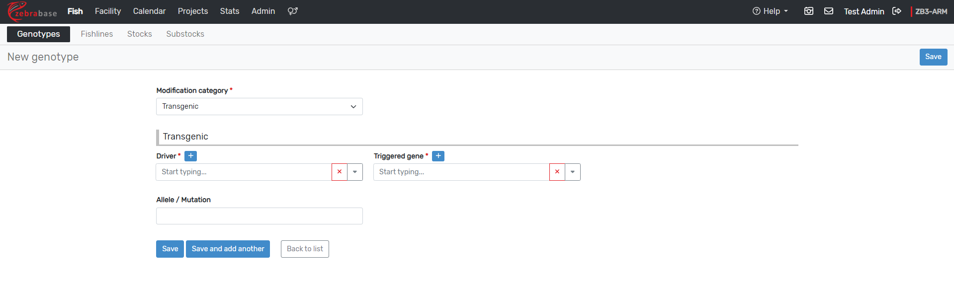 Genetically modified or mutant lines are defined by their genotypes. Each genotype describes one mutation/transgene, and their combination describes the fishline. If the genotype is already stored in the database, start writing into the genotype field and select from the suggested options. If you need to assign more genotypes, repeat the procedure.