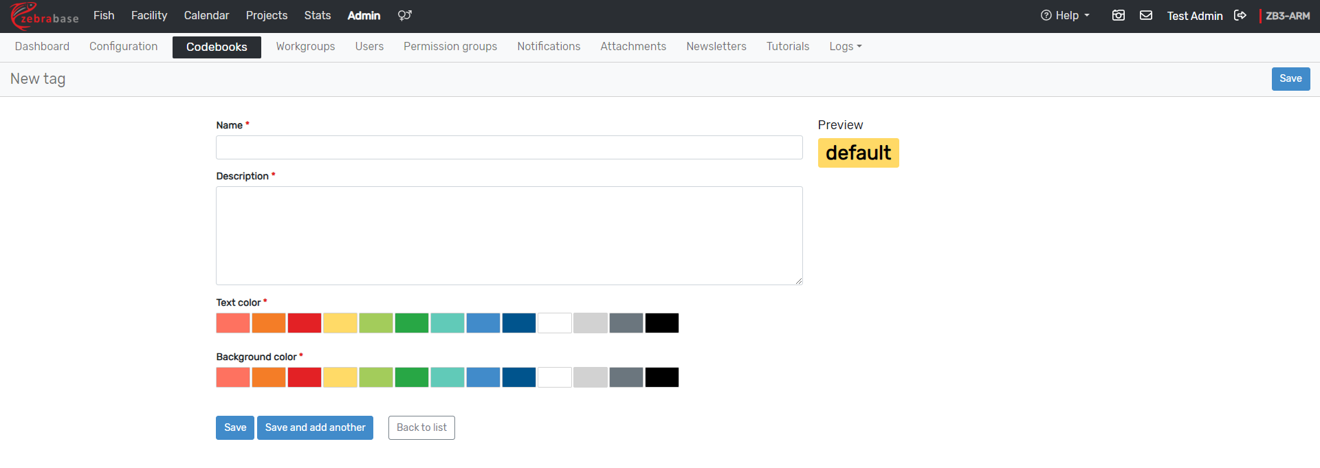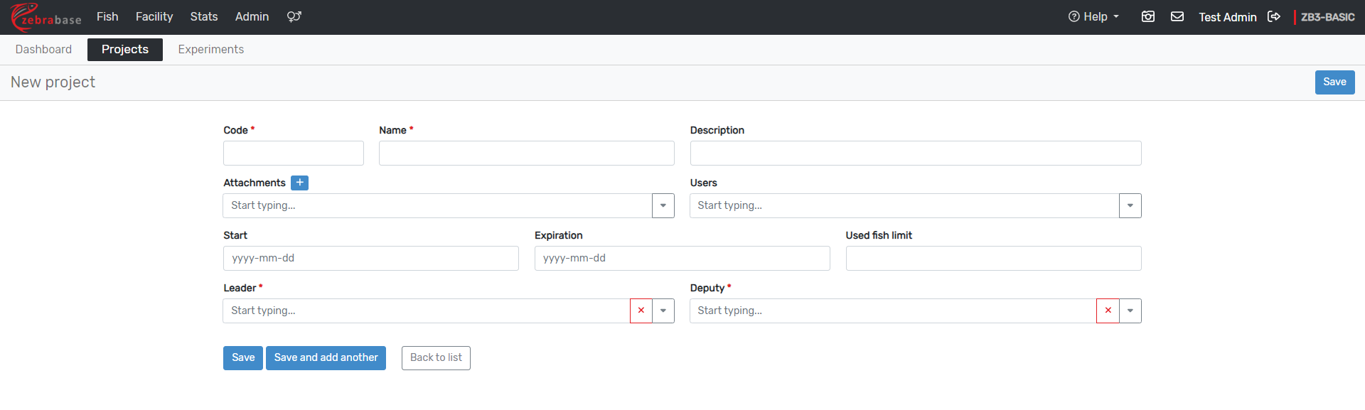 Projects can be used to specify different project licenses/IACUC codes/permission IDs or simply to separate fish into different projects. Enter the name and optionally also description and attachment for each of your projects and then Save or Save and add another.