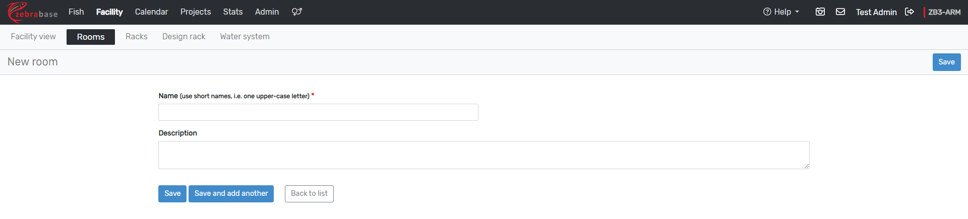 Create the first room of your facility and then press Save and add another to define more rooms or simply Save and continue to the next part of the facility configuration.