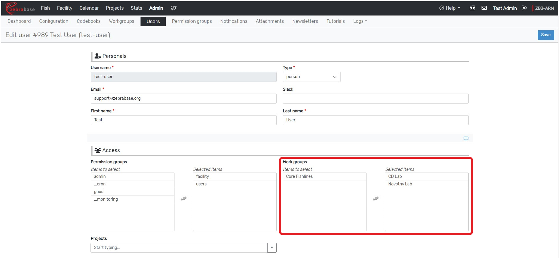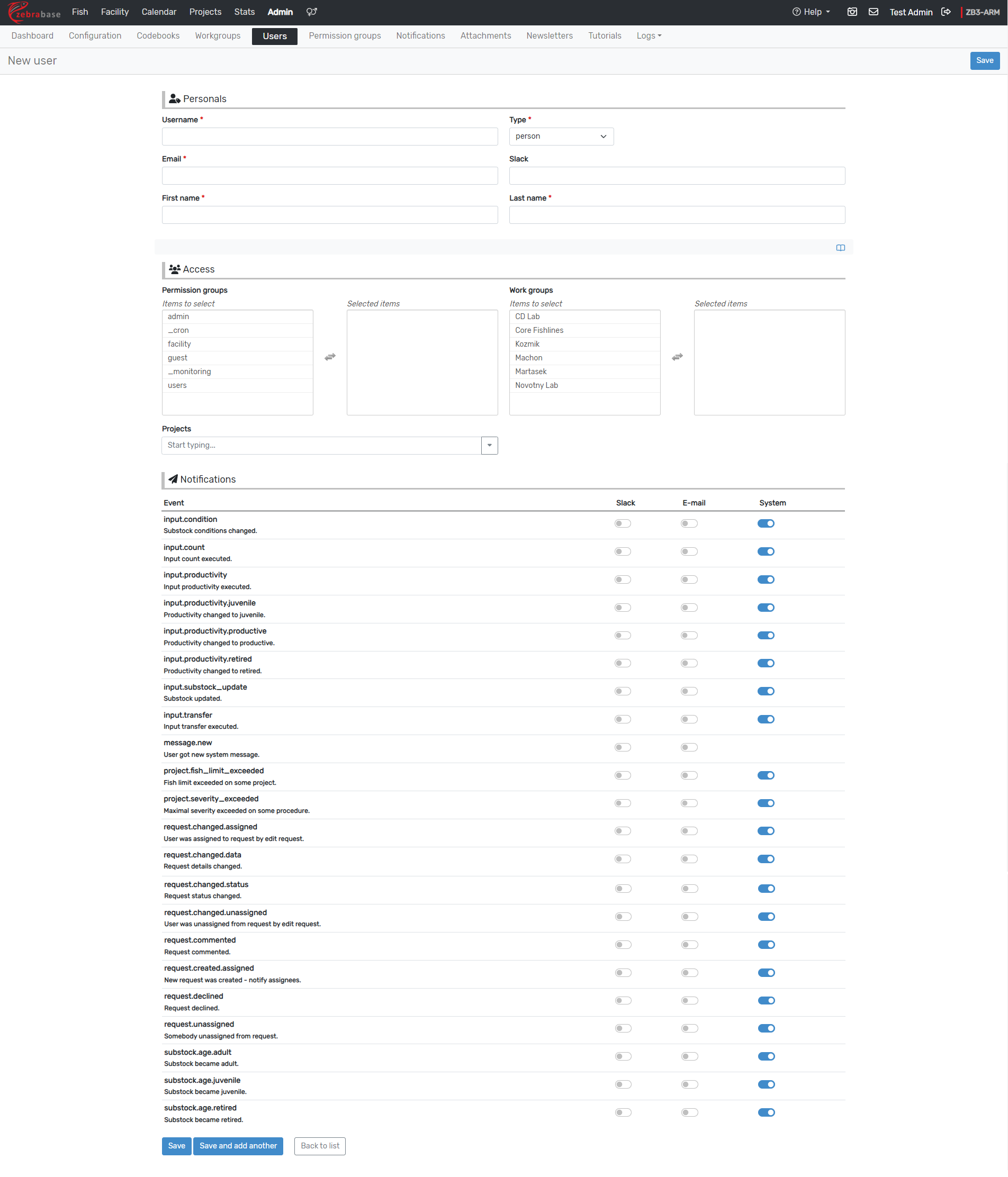 Define additional details Adding the Slack user name is optional, as well as the projects the user participates in. Permission groups determine the access rights the user is going to have. In the default, there are four permission groups: guest, user, facility, and admin. The rights of each permission group can be reviewed by the admin in Admin / Permission groups. If a workgroup has been selected for the user, he/she will only see the data belonging to his/her workgroup. Users without a selected workgroup will only see the substocks and fishlines that do not belong to any workgroup. In the table at the bottom of the form, the notification settings can be defined. Each type of notification can be sent by one or more of the three types of channels: Slack, e-mail, and system notifications (inbuilt Zebrabase messaging system).
