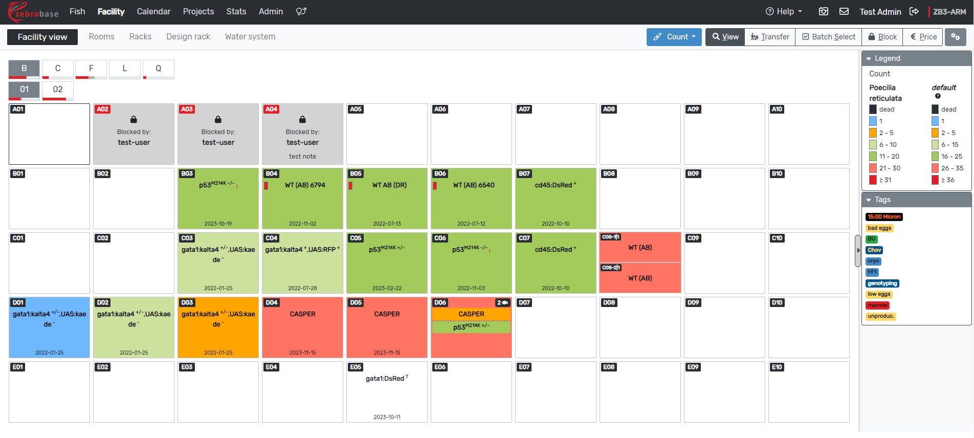 For welfare reasons, fish should be kept in densities between a minimum and a maximum. Zebrabase will color-code tanks according to their animal density in the Facility view.
