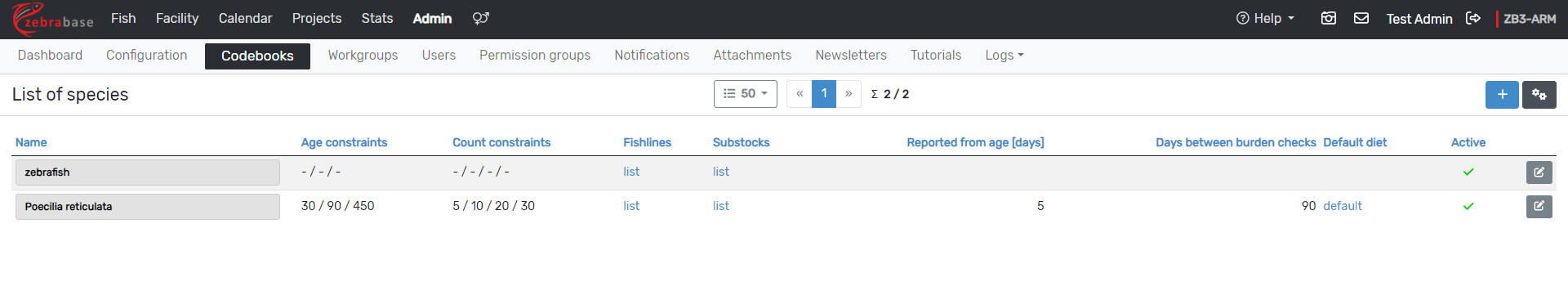 Zebrabase is suitable for any species of fish or any animals kept in groups. You can detail your species-specific parameters as age constraints, or liminal animal densities for tanks. You can also filter animals according to their species, or color-code them based on the species in the Facility view.